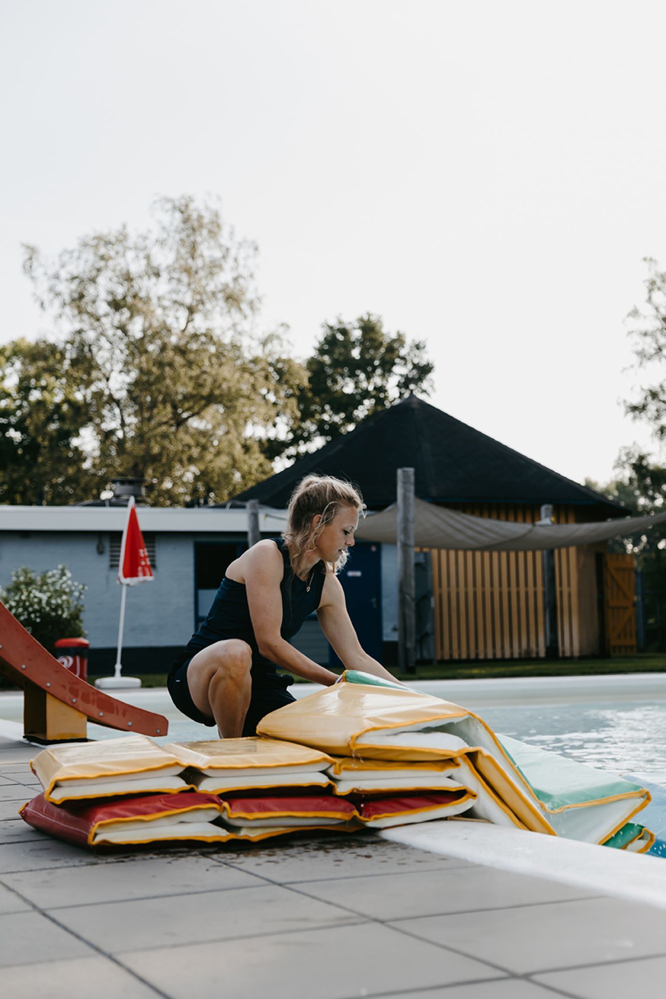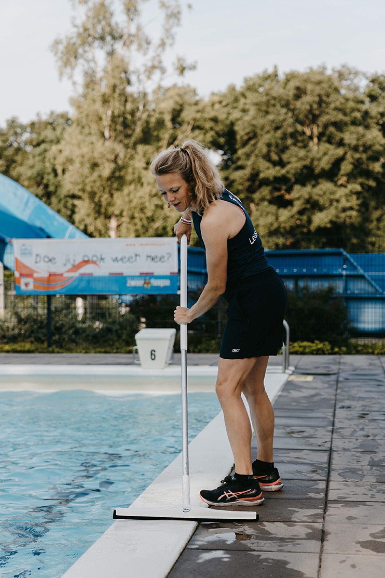 Tijdens het banenzwemmen probeer ik ook altijd wat kleine klusjes te doen, natuurlijk met zicht op het water en onze zwemmers. Buiten werken betekent: vegen, goten schoonmaken, stofzuigen in het bad, mos verwijderen... Er is altijd wel iets te doen!