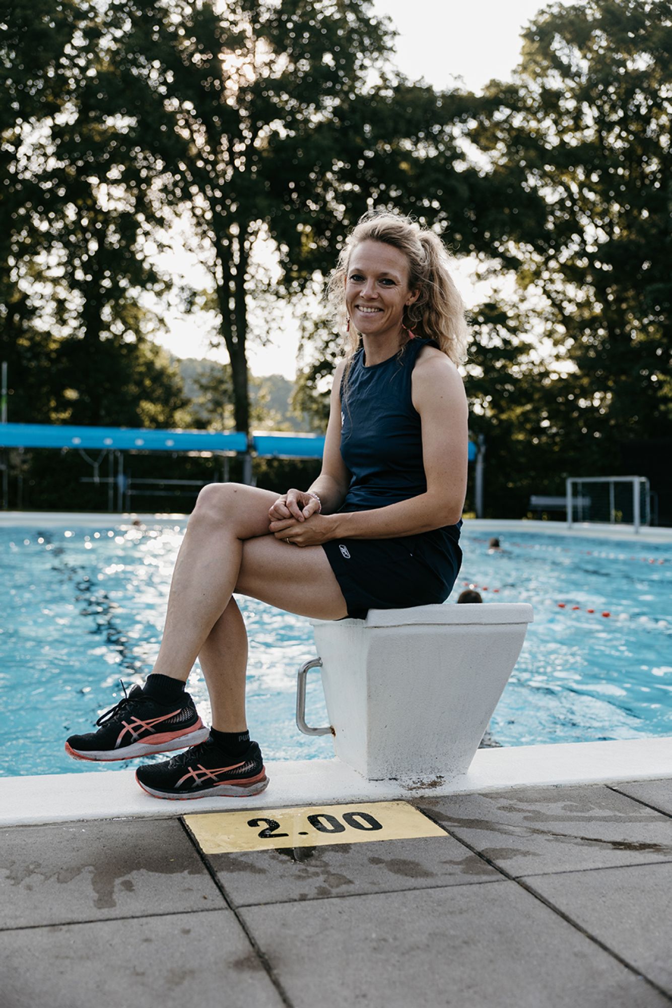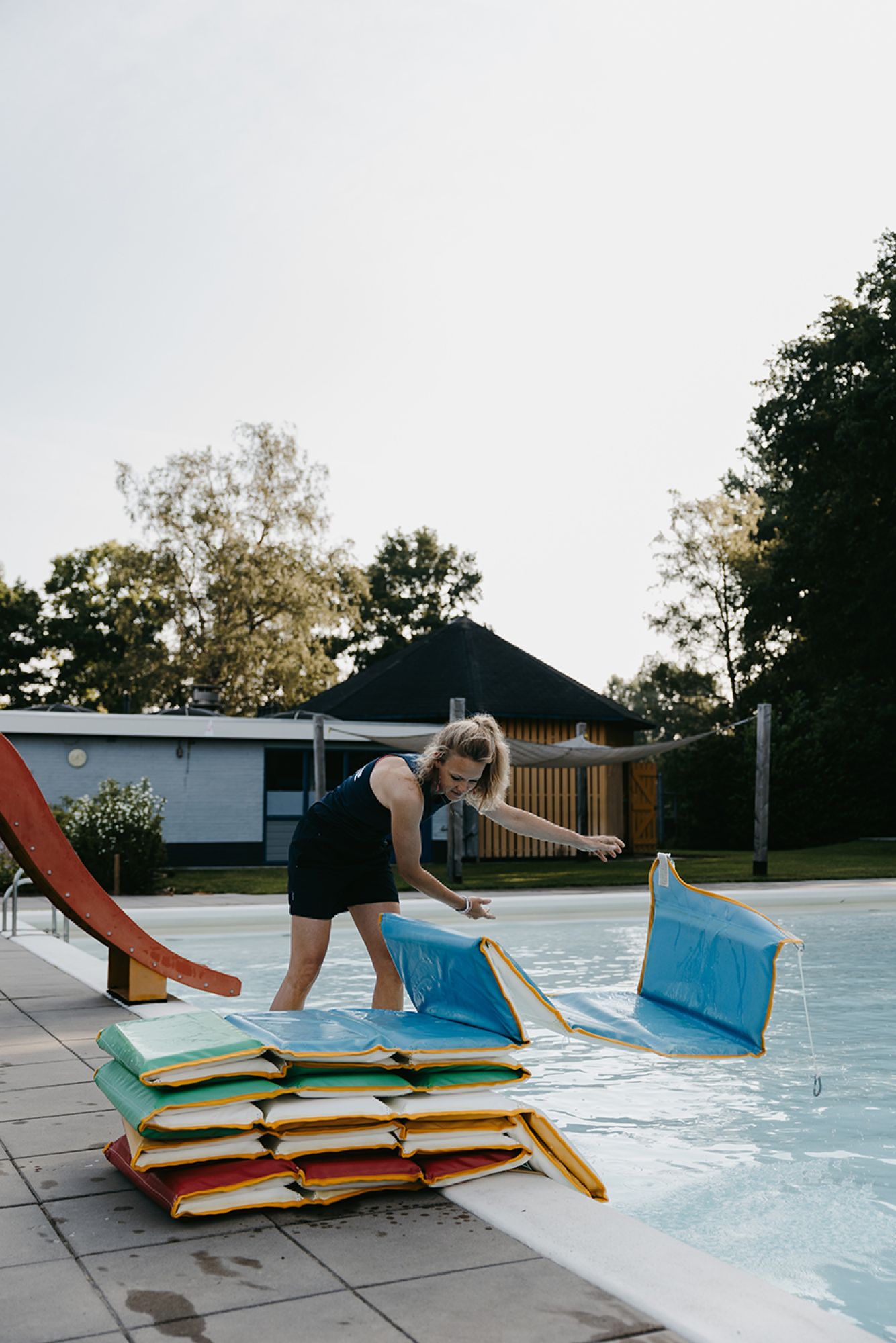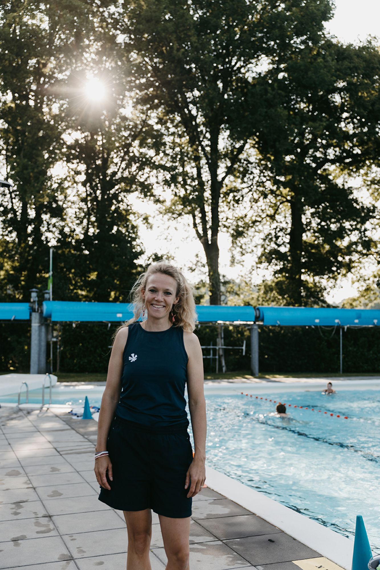 Dinande realiseerde zich pas, terwijl ze dit schrijft, dat dit alweer haar 20e seizoen op het Leussinkbad is! In 2005 begon ze als kioskmedewerker, later als toezichthouder en zwemonderwijzer op het mooiste buitenbad. Toen had ze nooit gedacht dat ze er zoveel jaren later nog steeds zo verknocht aan zou zijn. Inmiddels is ze sinds 2019 beheerder en houdt ze zich het hele jaar door bezig met alles wat er op en rond het bad gebeurt. En in de maanden maart tot en met september? Dan is het écht alle hens aan dek. Geen dag is hetzelfde – en dat maakt het intensief, maar leuk!05.30 uur – Mijn wekker gaat vroeg. Douchen, ontbijt klaarzetten voor mijn gezin en dan stap ik rond 6.10 uur op de fiets richting het Leussinkbad. Even een frisse neus, hoofd leeg, de dag gaat beginnen... Om 6.20 uur draai ik het hek open. Samen met een vrijwilliger starten we op. Zij in de kiosk en ik in de machinekamer en rondom het zwembad. Ik noteer meterstanden, maak de haarvanger schoon, vul de dagtank met chloor, meet de waterkwaliteit, bekijk de watertemperatuur, vul alles in op de laptop, haal de dekens van het bad, leg de lijnen in het water en zet de borden voor het banenzwemmen klaar. Ik check nog even of er geen vreemde dingen zijn in of rondom het bad. Iets voor zeven uur zijn we startklaar. Dan druppelt onze trouwe club ‘Vroege Vogels’ binnen en begint het toezichthouden.